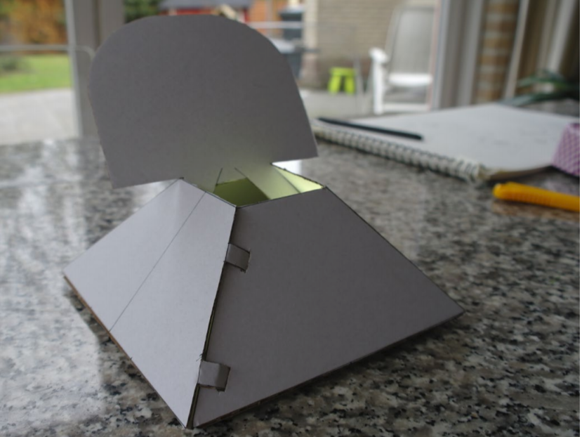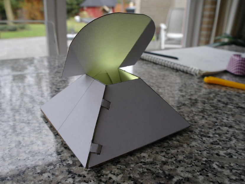 De vormgeving van de lamp is geïnspireerd op een vulkaan. Er is een pyraminde vormige constructie waar een lamp in zit. Door een klepje kan de gebruiker zelf bepalen hoe deze het licht wil gebruiken. De gebruiker kan kiezen voor licht op het bureau door het klepje naar voren te zetten of om de gehele ruimte te verlichten en het klepje naar achteren te zetten.